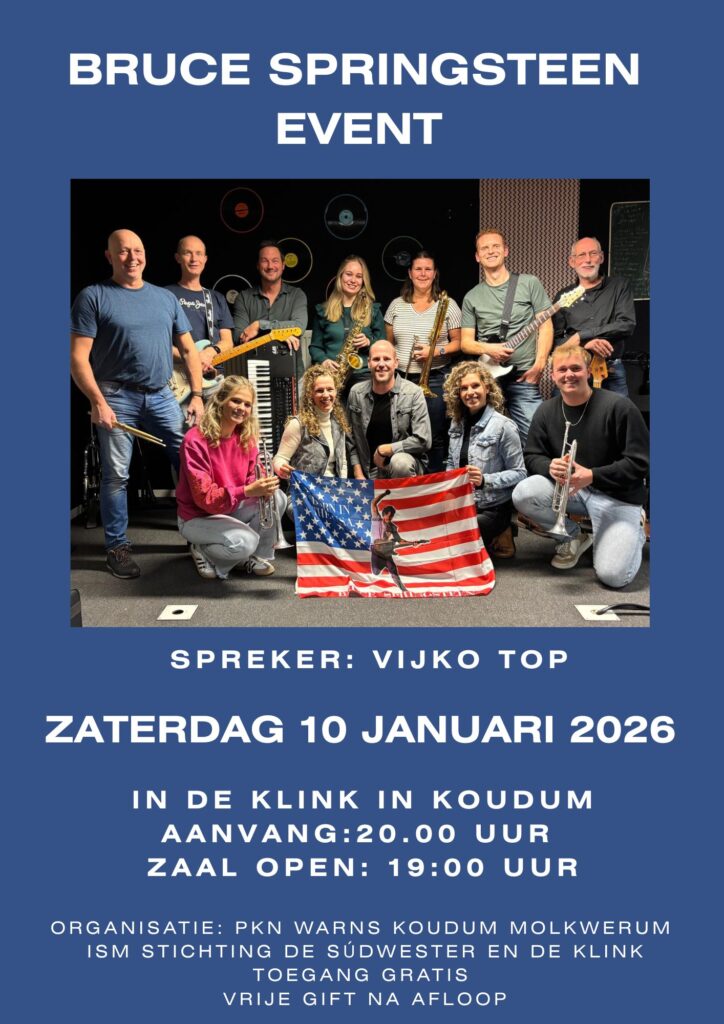 Op zaterdagavond 10 januari 2026 is er een ‘Bruce Springsteen event ‘ in De Klink in Koudum.